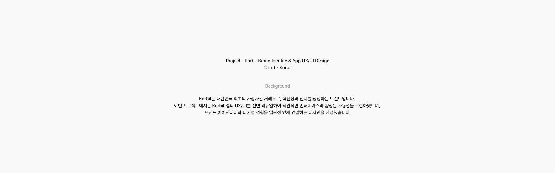 Client : Korbit Scope : Brand Identity, Web Design Year : 2021 korbit's brand renewal was initiated to strengthen its brand identity and enhance the user experience in response to the evolving cryptocurrency market and the company's growth strategy. The cryptocurrency exchange industry is rapidly evolving, requiring brands to redefine their distinctiveness and trustworthiness to stay competitive amid new trends and regulatory changes. Through this renewal, korbit aims to provide a more modern and intuitive brand experience while reinforcing its position as a reliable and innovative platform.