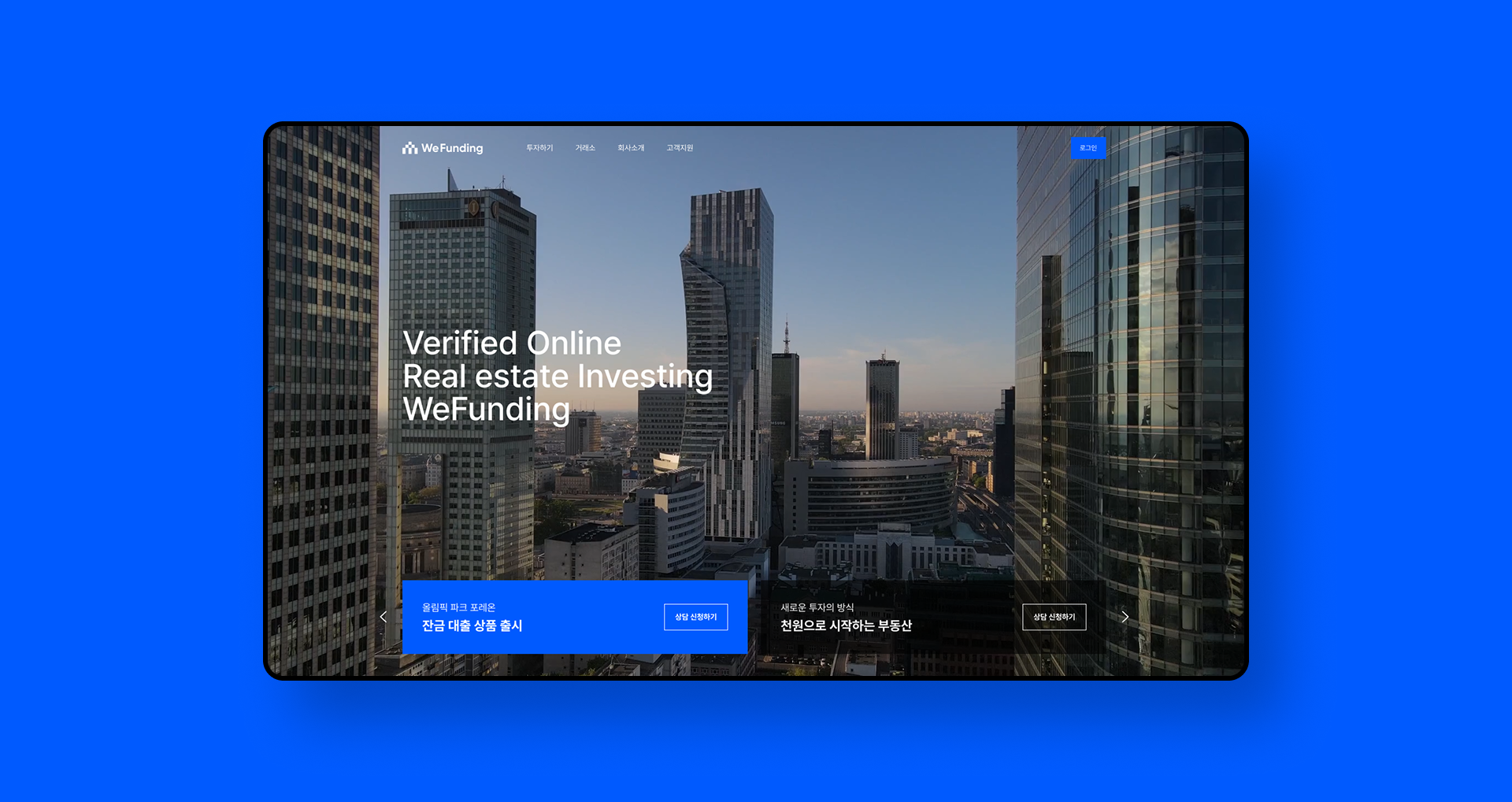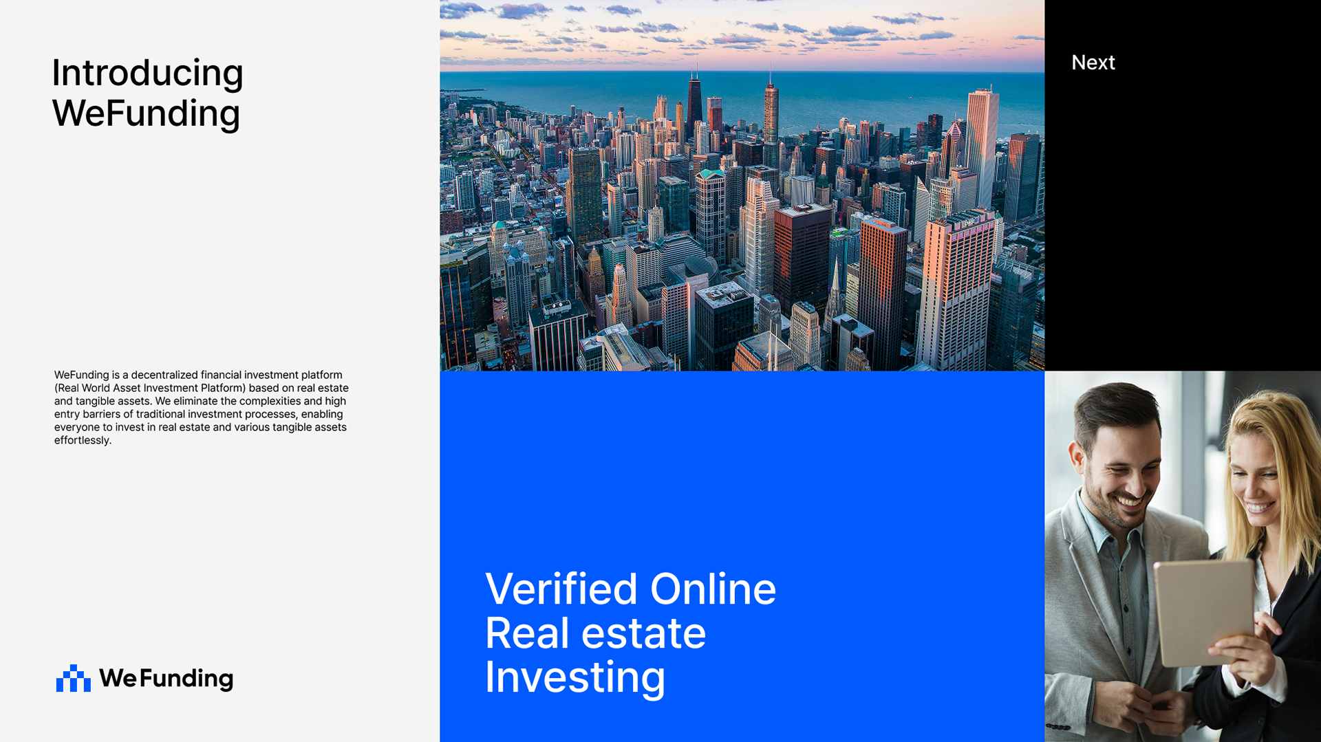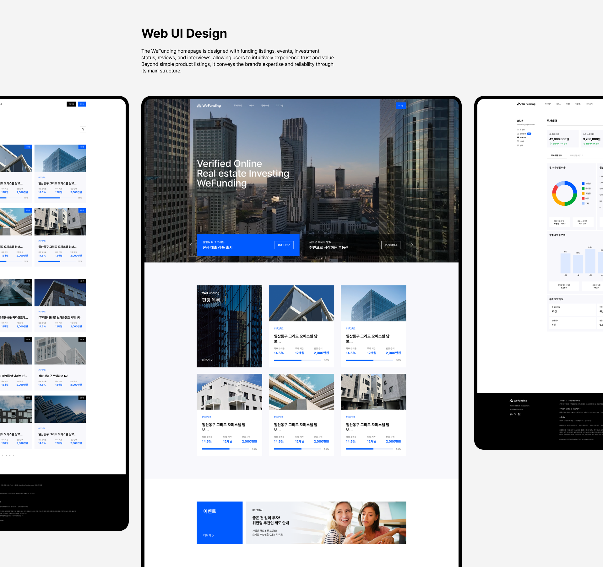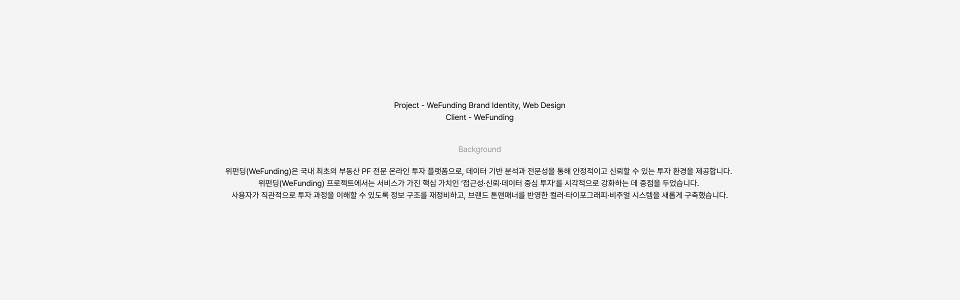 Client : WeFunding Scope : Brand Identity, Web Design Year : 2024 WeFunding is a decentralized financial investment platform (Real World Asset Investment Platform) based on real estate and tangible assets. We eliminate the complexities and high entry barriers of traditional investment processes, enabling everyone to invest in real estate and various tangible assets effortlessly.